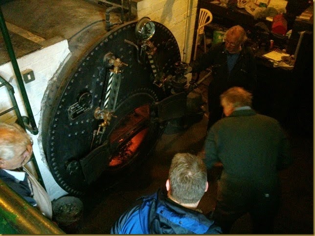 Steam for the engine comes from a Cornish-style boiler, running at around 30psi. This is lower pressure than when it was fully operational, but the load is considerably less. The original boiler was a Lancashire pattern of about twice the capacity, but this had deteriorated beyond repair. The current one came from a swimming pool in Tunstall when it was replaced by gas heating. Recycling at it’s best!