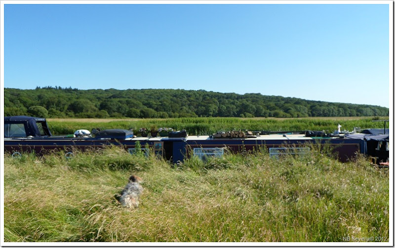 Another reason to move, at least from my point of view, was that the mowing contractors had just gone by. Meg and freshly cut grass seem to have a magnetic attraction, at least until she gets back on board, when it all miraculously falls off!